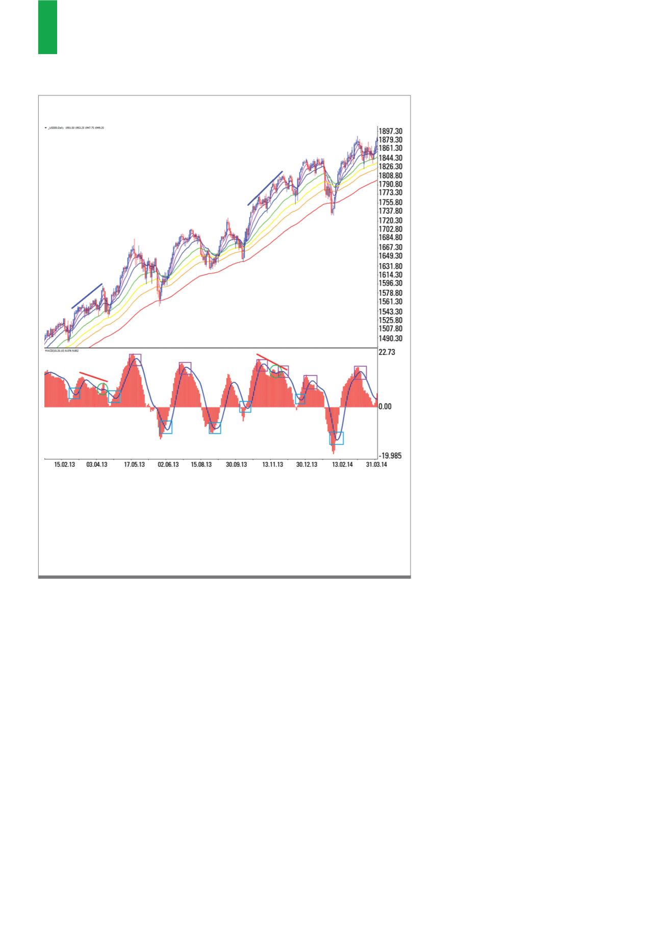 γραμμές σημειώνονται τα σημεία απόκλισης του MACD με το διάγραμμα του S&P 500,